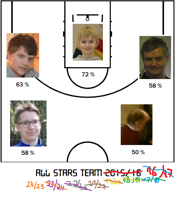Co do procentuální úspěšnosti jsme měli čtyři nejlepší hráče v celé soutěži, účast v All Stars tak letos visela vysoko. Premiérově se stal klukem z plakátu Honza „Švestková“ Pecka, podruhé jeho jmenovec Honza „Tralalá“ Fiala. Oba borci dokázali podržet v klíčových zápasech z hlediska postavení v tabulce nebo personální krize v týmu. A aby to bylo hezky odstupňované, třetí nominaci si vysloužila jistota zadních řad Zdeněk „Inženýr“ Chybný. Takových inženýrů se rozhodně kýbl netento nedá, jak říkával Láďa Fabián. Věřme jen, že na fotce (alespoň na jedné) je to skutečně náš předseda, jistý si nejsem.