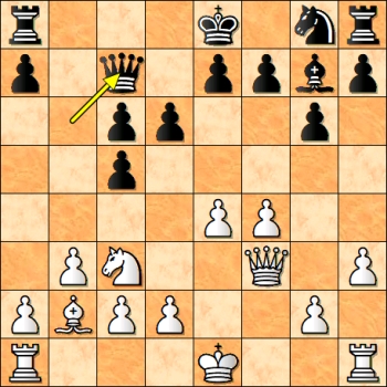 V pozici je mat třetím tahem. Mé dosavadní tahy mě těší, ale netěší mě, že jsem nenašel mat třetím tahem, i když jsem úvodník viděl. V partii se stalo 13…Jc2+, což je mat čtvrtým tahem: 14.Kf3 (14.Kd2/d1 Dxe1#) 14…Jxe1+ 15.Ke2 Df2+ 16.Kd1 Sc2#. Mat třetím tahem je