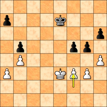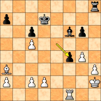 Dosud byla pěšcovka remis, ale poslední tah je prohrávající chyba. Průlom jsem viděl okamžitě: 38…f4+!! Nelze 39.gxf4 gxh4 s jednoduchou výhrou černého. Stalo se 39.Kf2. Nyní se mi zdálo, že nejde 39…fxg3+ 40.Kxg3 gxh4+ 41.Kxh4 Kf6 42.Kh5 Kf5 43.Kxh6 Kf4 44.Kg6 Kxf3 45.Kf5 a měl jsem obavy, jestli to ještě neskončí mou prohrou, ale objektivně je to remíza. Zahrál jsem 39…Ke6? s chybnou domněnkou, že bílý král nemá pole c3 a vyhraju. Ale po 40.hxg5 hxg5 41.gxf4 gxf4 42.Ke2 partie brzy skončila smírně.