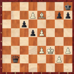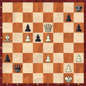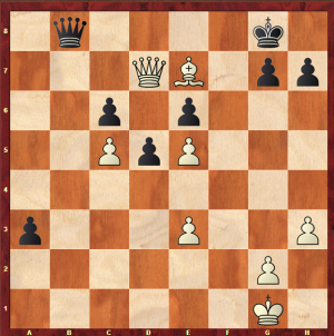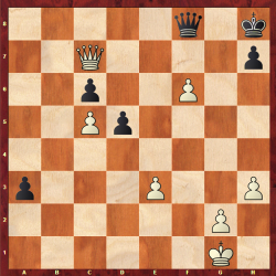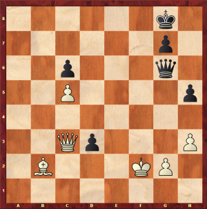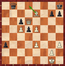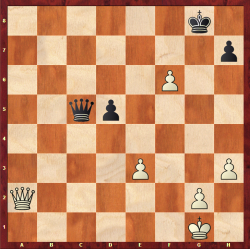 Remízu drželo paradoxní 34…Db3! Vysvětlím u dalšího diagramu. Kdo by ale odolal umístit dámu na políčko, z něhož doprovází pěšce až do domečku?