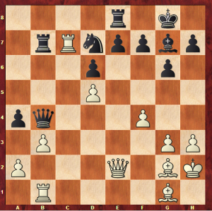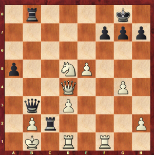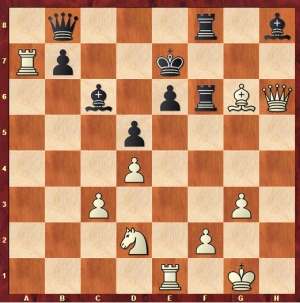 V 17. tahu jsem obětoval střelce za pěšce a vyzval jsem černého monarchu na smrtící tango. Ve složité pozici jsem ale těsně (o milimetry) minul své šance a soupeřka se ubránila, nicméně prasopozici minutu na minutu jsem sehrál mnohem lépe a mohl jsem sklízet. Zkuste vymyslet bílého vítězné pokračování. Řešení se zobrazí při najetí sem.