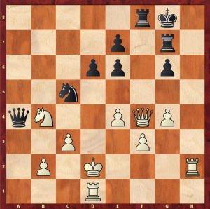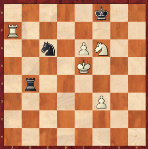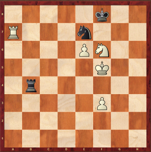 Svými kousky jsem se opravdu bavil, nejlepší bylo, že jsem soupeřčiny výhry viděl hned po položení figurky – to je teprve napětí při čekání na tah! Závěrečná historka pak nasadila korunu mému chaplinovskému výkonu. Silného soupeře jsem postupně přehrál (snad jediná normální partie, zbytek byla všechno děcka se slušnou taktikou, ale strategicky to bylo špatné), ale ten kladl dlouhý odpor v prohrané koncovce. Dokud jsou jezdci, je všechno možné. Zahrál jsem 1.Ke5? – za prvé, mohl jsem 1.Vxe7. Za druhé, budou vidličky… 1…Jc6+.