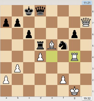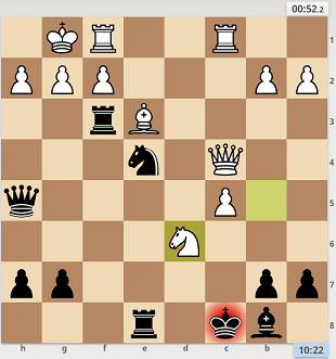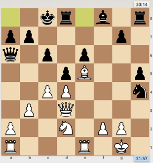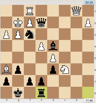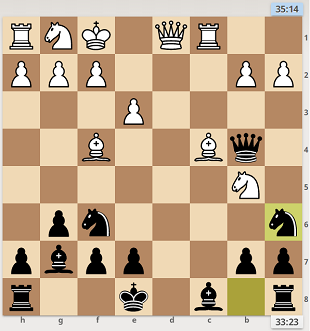 Marná sláva, hrát příliš pomalu, to je jako nevidět vidličky na věže nebo nastavit střelce. Ani tajemnému panu urbisovi nestačilo 40 minut na partii, a ačkoliv v pozici na diagramu mu hlásí počítač výhodu +13 (to je v přepočtu na materiál 13 pěšců, což je samozřejmě nemožné), pohled na jeho hodiny už napovídal, že se blíží smutný konec. World leading 1...f5 player tak opět využil hlavní přednosti tohoto gambitového zahájení - lepšího času.