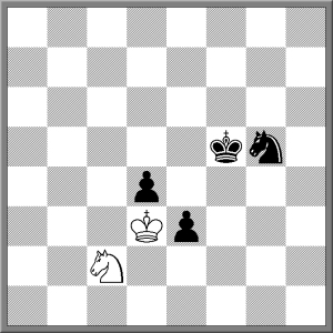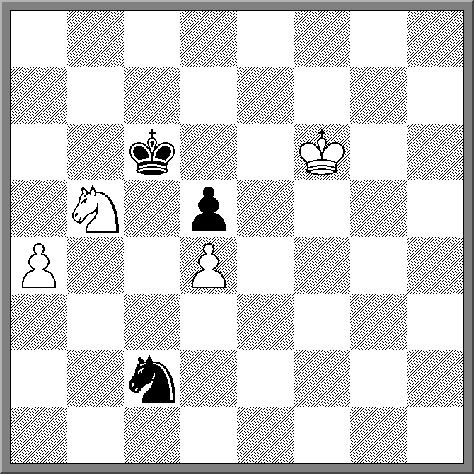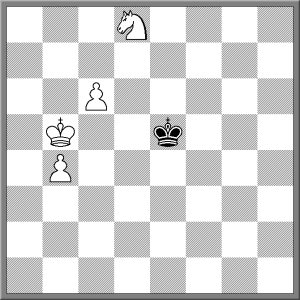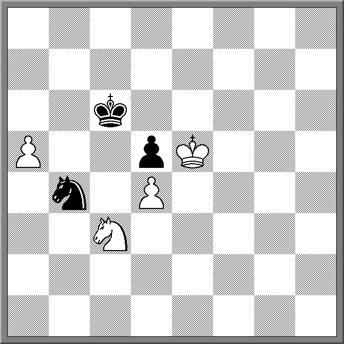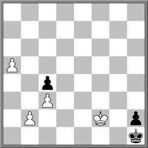 Tak v jednom z venkovských turnajů se hrála partie, ve které vznikla posice na vedlejším diagramu. (bílý a5, b2, c3, Kf2 - černý c4, h2, Kh1) Bílý byl na tahu a zahrál 1. b2–b4. Po tomto tahu vznikl velký spor, který si vyžádal zasedání výboru oddílu a také dlouhé korespondence mezi šachovým oddílem a krajskou sekcí a nakonec i redakcí našeho časopisu. Pravděpodobně bude velká většina čtenářů překvapena, proč ke sporu došlo. Po tahu 1. b2–b4 totiž černý reklamoval remis v domnění, že posice je pat. Bílý soupeře ovšm upozornil, že může pěšce brát mimochodem, černý však tvrdil, že brát mimochodem nemusí. Kapitáni i dva rozhodčí (oba absolventi krajského kursu rozhodčích!!) se dohodli, že případ předloží řídícímu soutěže (rovněž absolventovi tohoto kursu), který rozhodl, že partie je remis. (!) Předseda krajského sboru rozhodčích a zároveň krajský instruktor rozhodčích pak na dotaz jednoho z rozhodčích sdělil, že podle čl. 6 bod B Pravidel FIDE soupeř m ů ž e brát pěšce en p., z čehož vyvodil, že toto ustanovení neukládá soupeři povinnost, že by musel pěšce brát. Je až nepochopitelné, že o tak jasném případu bylo tolik sporů a je zarážející, že si s ním rozhodčí nevěděli rady a rozhodli špatně! Pat je taková situace, kdy strana, která je na tahu, nemá možnost provést tah podle pravidel, při čemž její král není v šachu. V naší sporné posici může černý tah podle pravidel učinit. Tímto tahem je cxb3 en p. Vzhledem k tomu, že jiný tah nemá k dispozici, m u s í cxb3 en p. hrát, nechce-li se ovšem již vzdát. Čs. šach 4/1957, 2. s. ob.