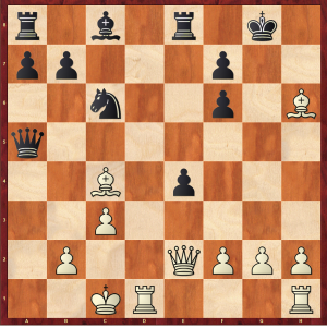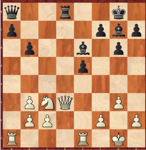 Přiznám se, že při tvorbě diagramů z této partie jsem trochu zklamaný. Celou dobu jsem si totiž myslel, že Martin obětoval za rozbití královského křídla figuru, a proto mi přišla partie nádherná. Teď už vidím, že to tak není, ale dobrá, pořád to není na ukázku úplně ošklivý… Bílý zahraje jediný přesvědčivě vyhrávající tah v pozici, zkuste najít. Řešení se zobrazí při najetí sem.