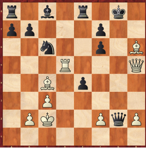 Pokračovalo se 18…Da1+ 19.Kc2 Dxh1 20.Dh5! na převodu Dh5-g6+ je útok založený. 20…Dxg2.