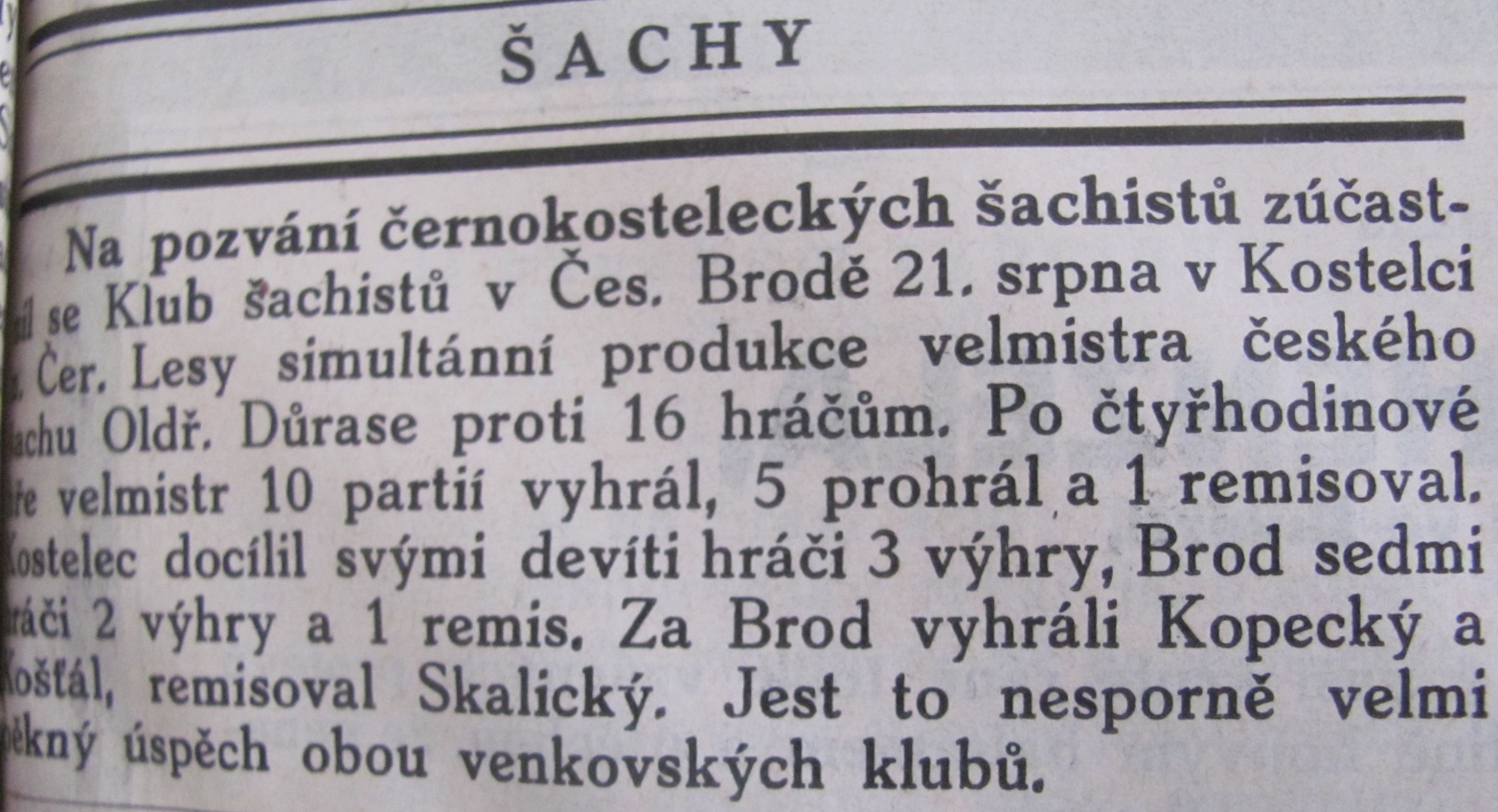 18.11.1923 | Simultánka s Oldřichem Durasem | Český Brod | +26 -2 =1 | ||||
