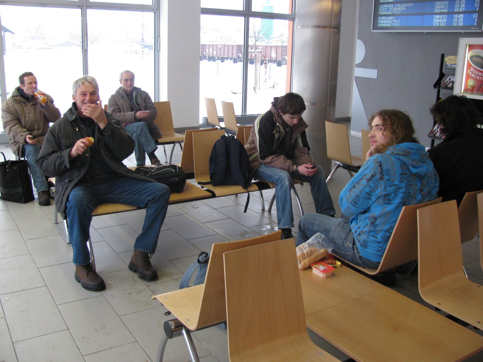 pokus o společnou fotku i se Standou, v čekárně nádraží ve Vlašimě