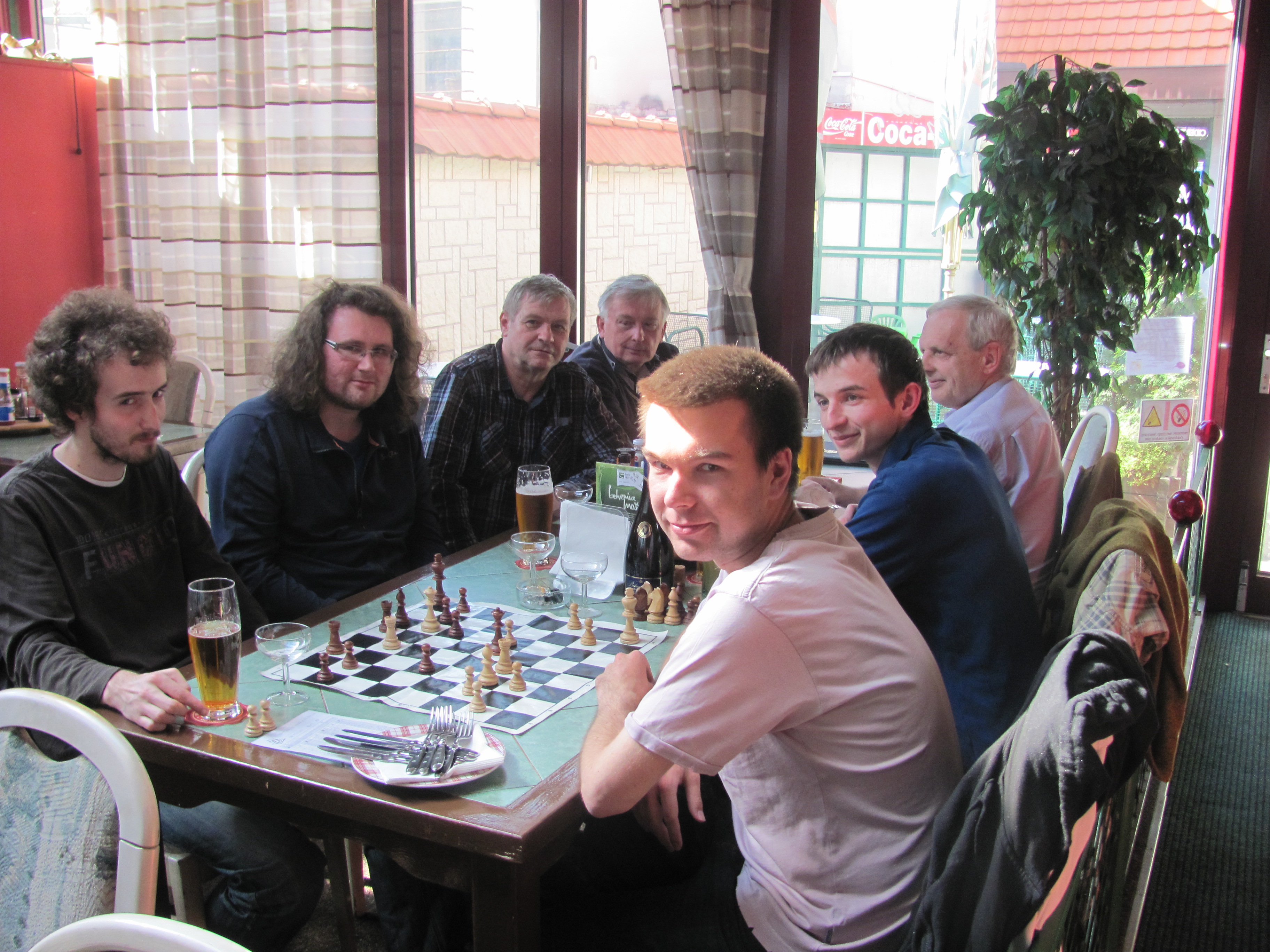 Zdravé jádro družstva A pečlivě dodržuje pitný režim po prohraném zápase posledního kola KSB 2014/2015 (v restauraci Kup)