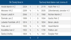 Dne 22. 3. jsme se pomstili za remízu s Kolínem a porazili jsem Bakov 6:2. V Kolíně jsme měli vyhrát, partie tam byly dost zajímavé, ale nebyl to nejpříjemnější zápas. Vítek Moravec se rozepíše v závěrečném článku. Toto bylo předposlední kolo, proto těsně před koncem.