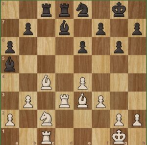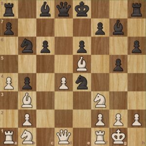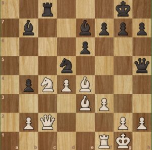 Černý na tahu. Přišlo ….Jf6,Dc2, a Sb7? a černý nezastaví a5 a6 a dáma bere c6. Poté k udivení všech soupeř nabídl remízu. Samozřejmě Honzík to přijal. Nechápu, proč ji nabízel, když bylo zřetelné, že stál lépe, ale to už se nikdo nedoví. Remíza pro černého v této pozici je úspěch.
