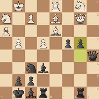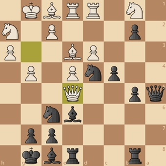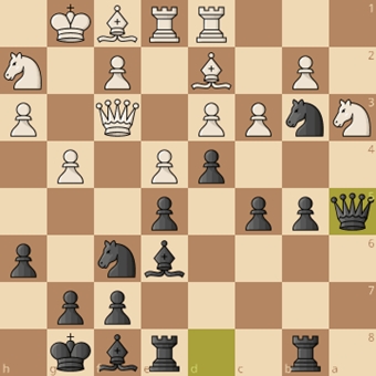 Už Da5 mi zabralo spoustu času, protože jsem už místo toho hledal nějaký konkrétní cesty k výhře materiálu. 20…Jxd2 21. Vxd2 dxc3 22. Bxc3 Da5 23. Jb1 je sice pro bílýho hnusný, ale neviděl jsem, jak získat nějakej materiál. Ani 20…dxc3 21. Sxc3!? (bxc3 taky jde) b4 22. Sxe5 bxa3 23. Sxb8 Dxb8 24. Sxa3 mě moc neoslovilo (tady teda hlásí počítač i přes materiální převahu bílého hodnocení -4, ale k tomu se u partie těžko odhodlává). Nakonec jsem ale usoudil, že prostě zvýším tlak na pozici a snad se stanou dobrý věci. Da5 ale povoluje 21. Sxh6!?, což je trošku nepříjemný. Přišel další zajímavej moment, kde šlo o to se rozhodnout mezi 21…dxc3 a gxh6. Nakonec jsem si zvolil 21…dxc3, protože mu hrozí 22…Jd4 a braní na h6 a zároveň mu hrozím i braní na b2. Přišlo 22. Se3 cxb2 23. Jc1 Jd4 24. Dg3 c4!? 25. Dxe5