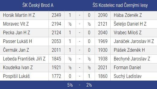 Remízová koncovka následovala ještě nějakou dobu, než hráči dosáhli pozice phillidor. Martin se ale snažil i tady, a nakonec soupeř v složité chvíli a s málo časem zaváhal a bylo po partii. Vyhráli jsme, 5,5 – 2,5.