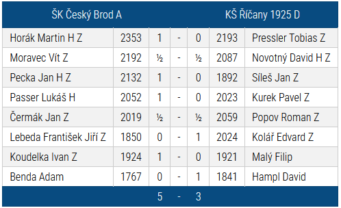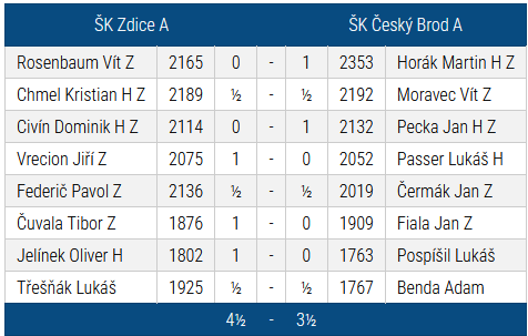 Se Zdicemi jsme minulé tři sezony vyhráli, tentokrát byl šťastnější soupeř. A to doslova, porážka pro nás byla hodně krutá. Honzík odmítl dvakrát remízu, Adam soupeře drtil, Lukáš Passer na tom byl po většinu partie rovněž lépe… Z těchto tři partií jsme nakonec uhráli jedinou remízu. Kompenzaci by domácí hledali snad jen v mé partii, kde jsem nejprve správně obětoval figuru za tři piky, ale následně jsem dovolil protioběť a po dalších nepřesnostech jsem přežil klinickou smrt i následnou nevšední koncovku. Partie velmi zajímavá, proto ji přikládám k přehrání. A tím bych to ukončil. Ztracené body, byť s velmi silným soupeřem.